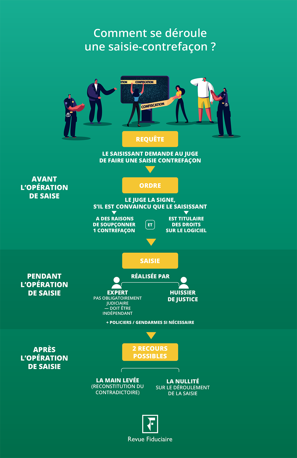 Cette infographie, issue du livre « les clés du droit des logiciels », présente de façon synthétique les acteurs et le déroulement de la saisie-contrefaçon.